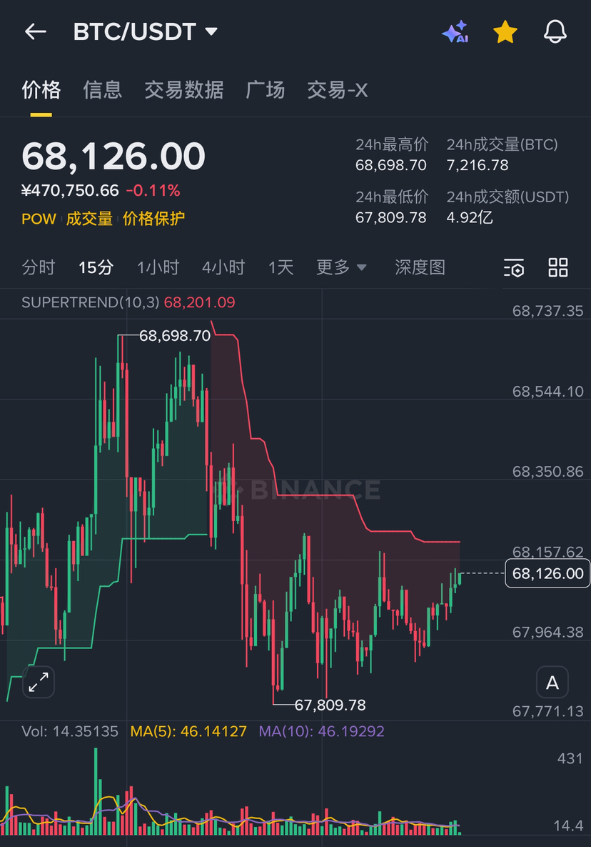 * BTC (68,126): 泰山压顶。15分钟图上,从 67,809 触底反弹后,现在的价格正死死顶在 SuperTrend 阻力线 (68,201) 下方。这不到 100 刀的距离,就是生与死的界限。如果不带量捅穿这根红线,现在的阳线就是“死猫跳”,随时会二次探底。