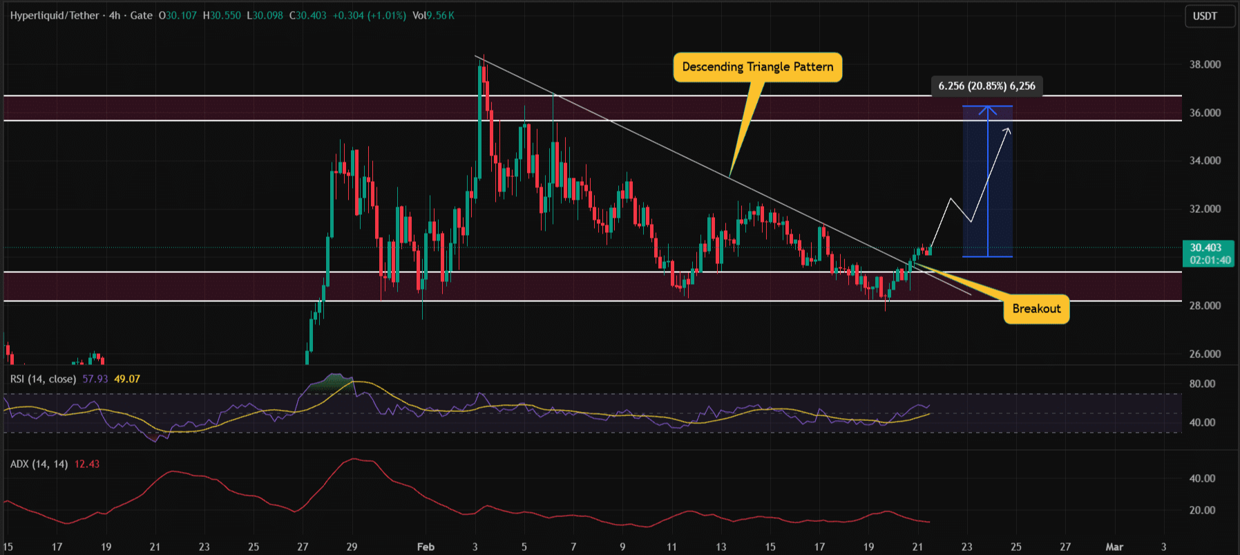 Trên biểu đồ 4 giờ, HYPE phá vỡ thành công mô hình tam giác giảm dần. Với chỉ số RSI đang ở mức lành mạnh 57.97, tài sản này vẫn còn nhiều dư địa để hướng tới mục tiêu trước mắt là $36.