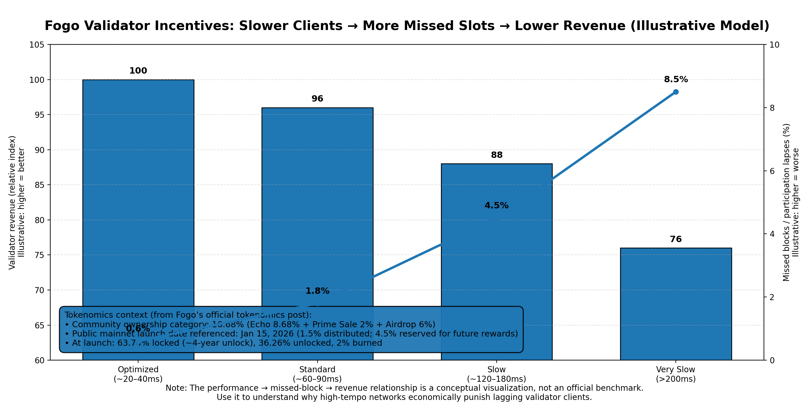 Now layer token economics on top, and you can see why “slower clients” becomes a revenue story that extends beyond the validator. In Fogo’s official tokenomics post, the project describes a community-first distribution structure and gives unusually specific numbers: two raises on Echo totaling $9.25M across roughly 3,200 participants, and a community ownership category totaling 16.68% (Echo raises 8.68%, Binance Prime Sale 2%, and a community airdrop 6%). It also ties a concrete 1.5% distribution to the public mainnet launch on January 15, 2026, with another 4.5% reserved for future rewards. Those aren’t just marketing milestones. They are moments when attention floods in, activity changes shape, and validators feel the load shift in real time.