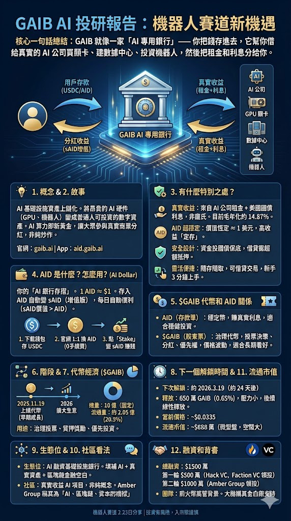 核心一句話總結: GAIB 就像一家「AI 專用銀行」——你把錢存進去,它幫你借給真實的 AI 公司買顯卡、建數據中心、投資機器人,然後把租金和利息分給你。