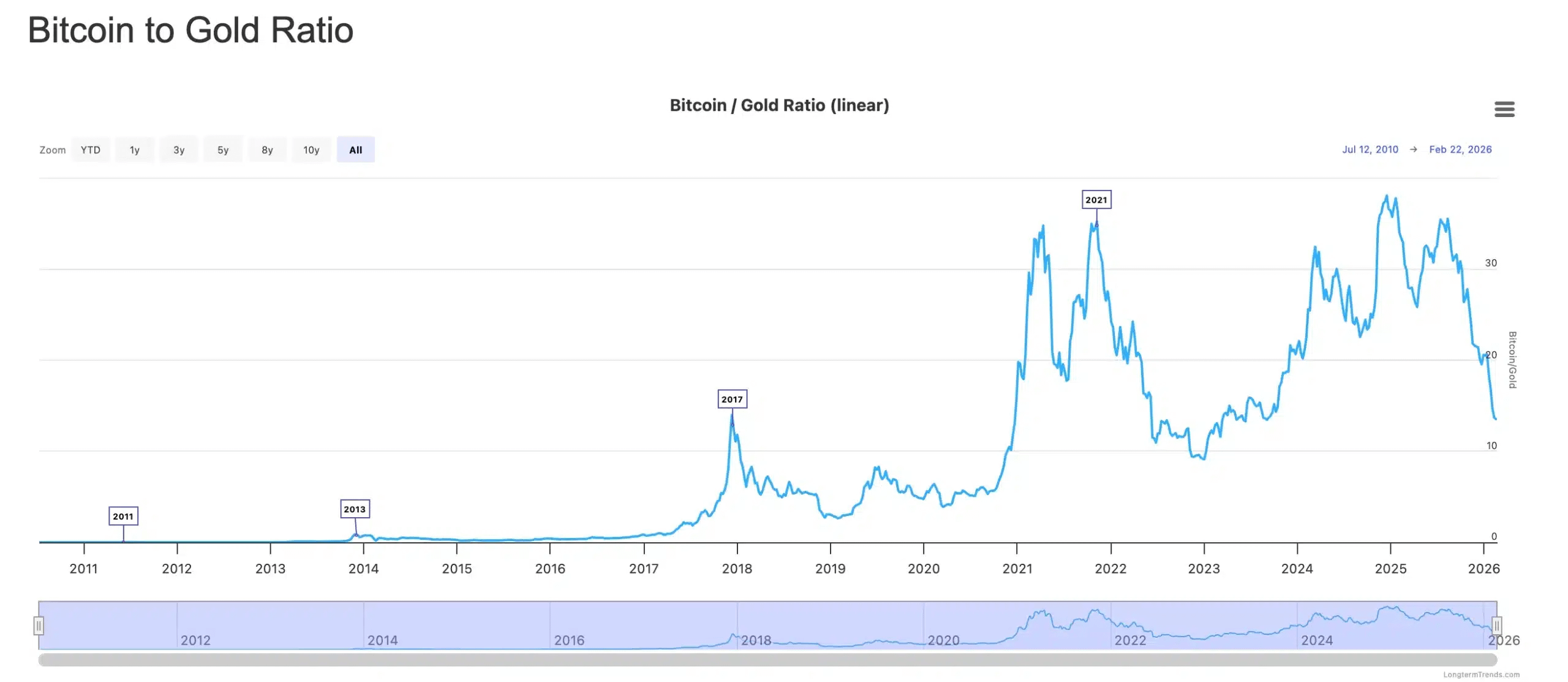 Tỷ lệ Bitcoin/Vàng đang lao dốc. Những nhà đầu tư từng mua BTC như một công cụ phòng ứng lạm phát tối thượng nay đang tích cực xoay vòng vốn sang vàng vật chất.