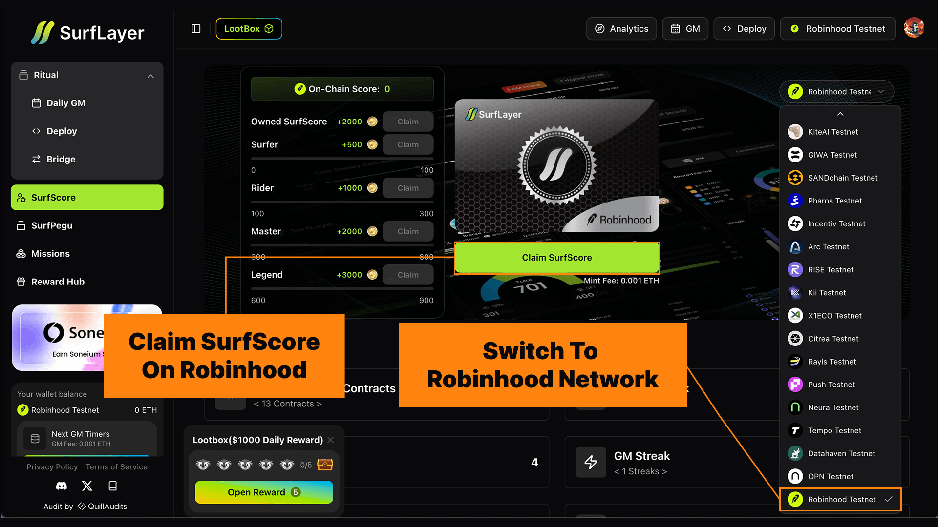 Users can mint a separate SurfScore for each supported network, including Robinhood Chain.