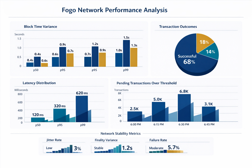 And if we want to be direct about data, what I want to see on Fogo is not a single peak number. It is the curves during peak hours, the variance of block time, the variance of finality, the transaction failure rate, the share of transactions stuck beyond a threshold, and the latency distribution at p50, p95, p99, because those curves are what tell you whether Fogo holds cadence through real capability or just a lucky moment.