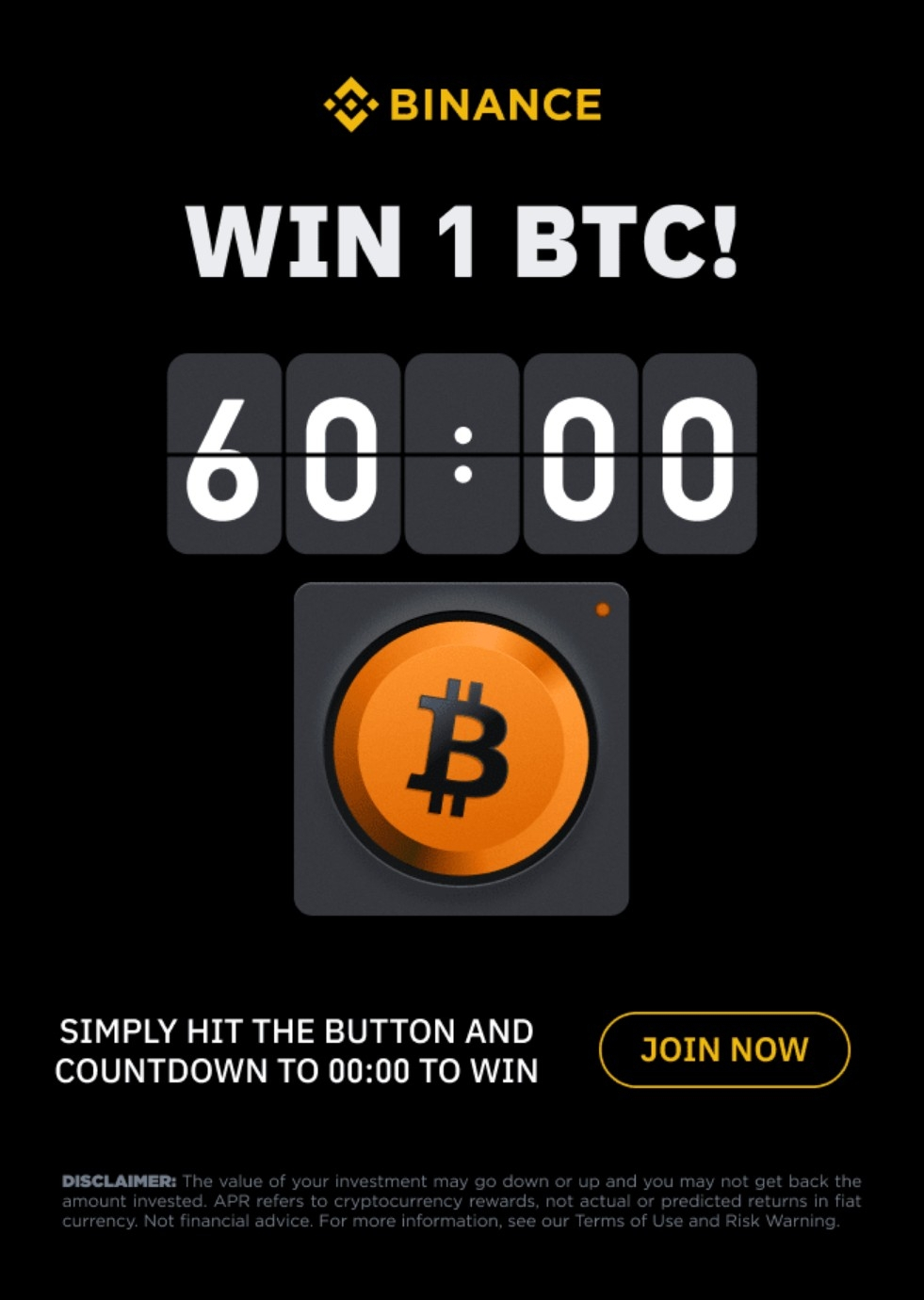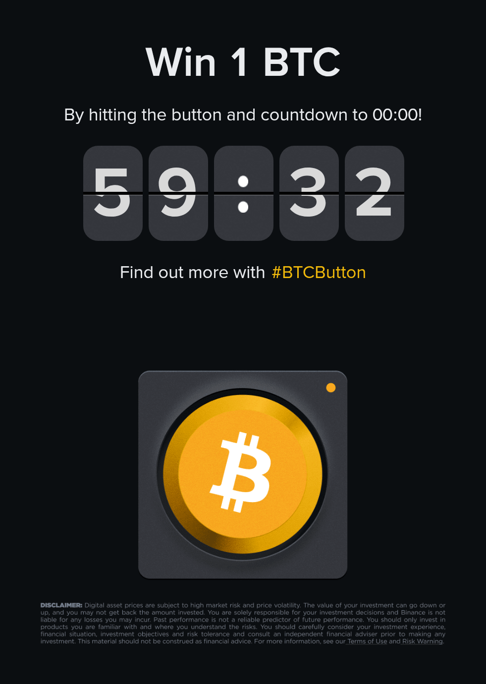 Join the Binance Button Game and win 1 BTC if you manage to count down to 00:00!