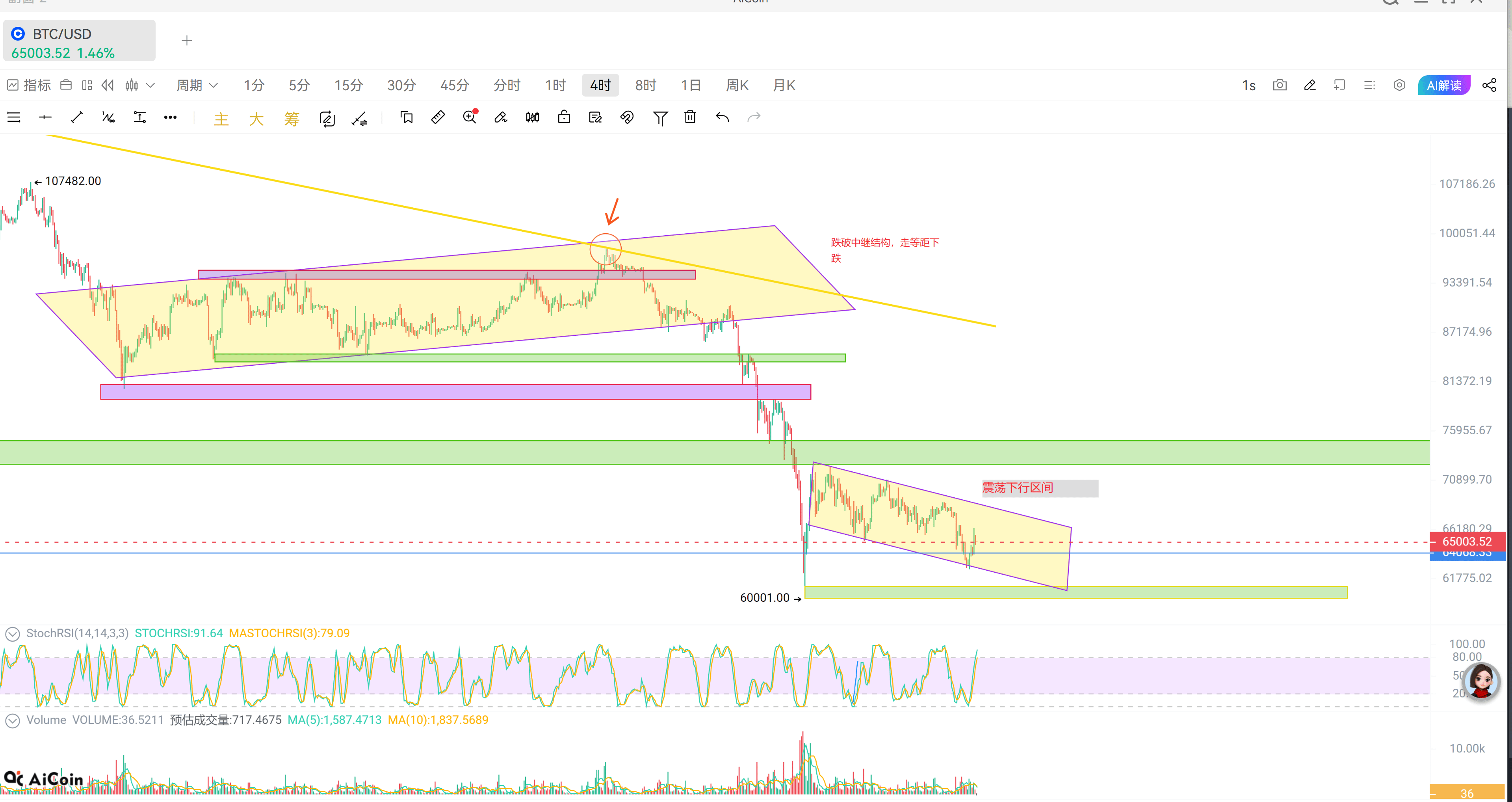 那么,目前我们来看下图1:前面我们也提醒了,大饼会走五浪下跌走势,目前已经到4浪阶段,再看图2:4小时级别,大饼正走黄色平行震荡下跌区间,二探新低60000附近轨道中,目前我们关注这个区间,如果能突破区间上轴,则标准4浪的走势会跟我们图1所示到达72000附近再下跌,如果震荡平行区间跌破不能迅速收回,那么大饼则加快向50000-52000位置。总之,两种走势最终都会下跌至下方50000-52000位置。
