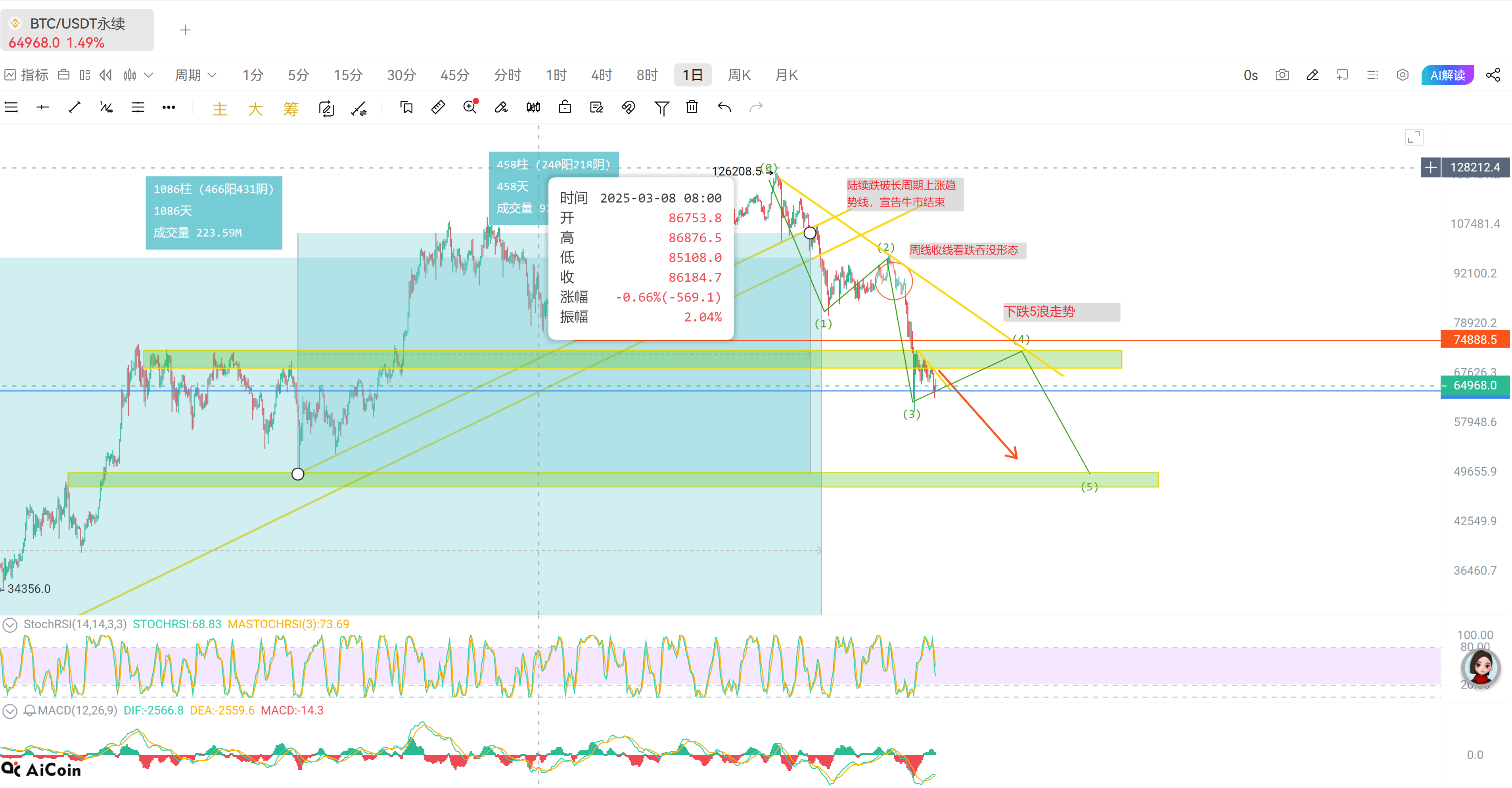 大家新年好,今年更新来了。目前大饼报价65000左右,前面11月初的时候我们就提醒大盘跌破长周期上涨趋势线,已经进入熊市,随后大盘就暴跌,到80000的时候反弹走 一个中继结构我们又提醒会走差不多等距的一个下跌,随后暴跌至60000左右,中继的多次分析提示可以翻看前面帖子。