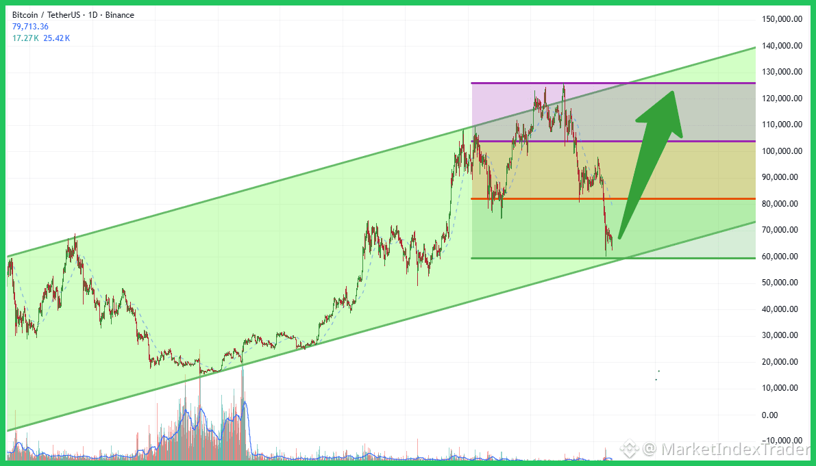 We're looking at the BTC/USDT 1D chart, and what stands out is the clear, long-term bullish channel Bitcoin has been trading within. After a significant run-up, price has retraced precisely to the lower boundary of this channel, which historically has served as robust support. This critical support zone sits roughly between $60,000 and $65,000. Immediate resistance levels to watch are around $82,000 (previous support) and then $105,000. This current retest of the channel's base is a pivotal moment.