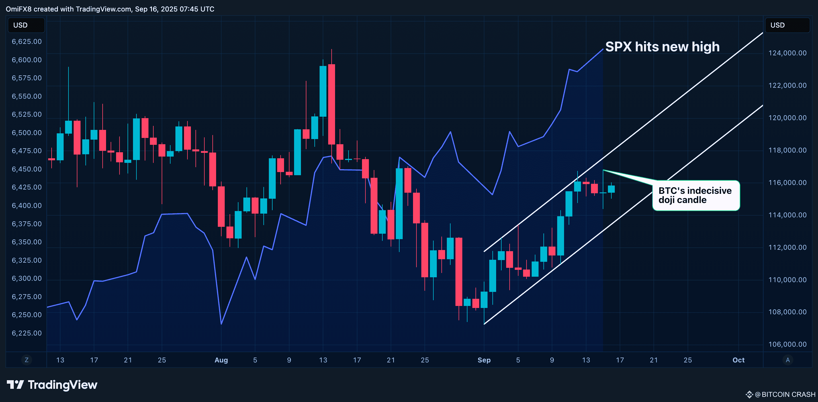 Когда акции растут, а Bitcoin рисует доджи — это не просто пауза. Это предчувствие.