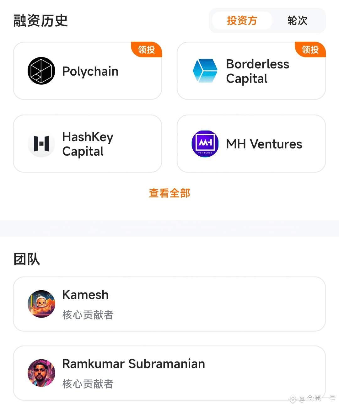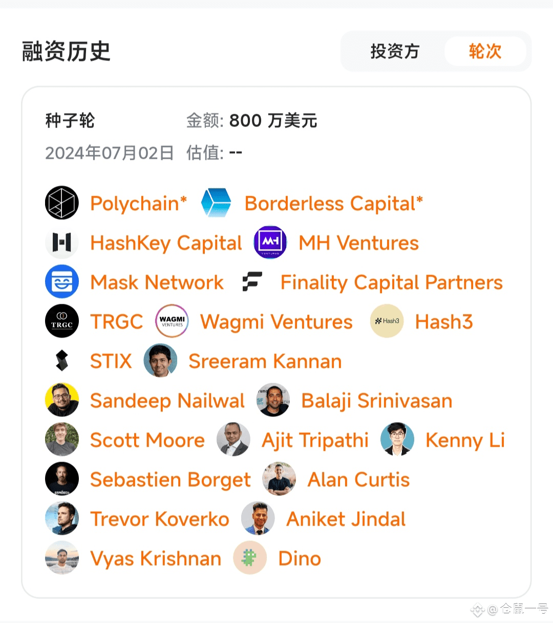 - 机构投资方:HashKey Capital、MH Ventures、Mask Network、Finality Capital Partners、TRGC、Wagmi Ventures、Hash3 等多家头部机构参与;