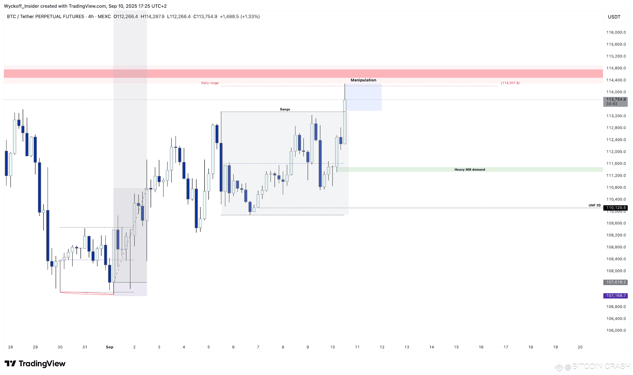 • EMA: 20-дневная выше $114.3K, 50-дневная — $113.8K