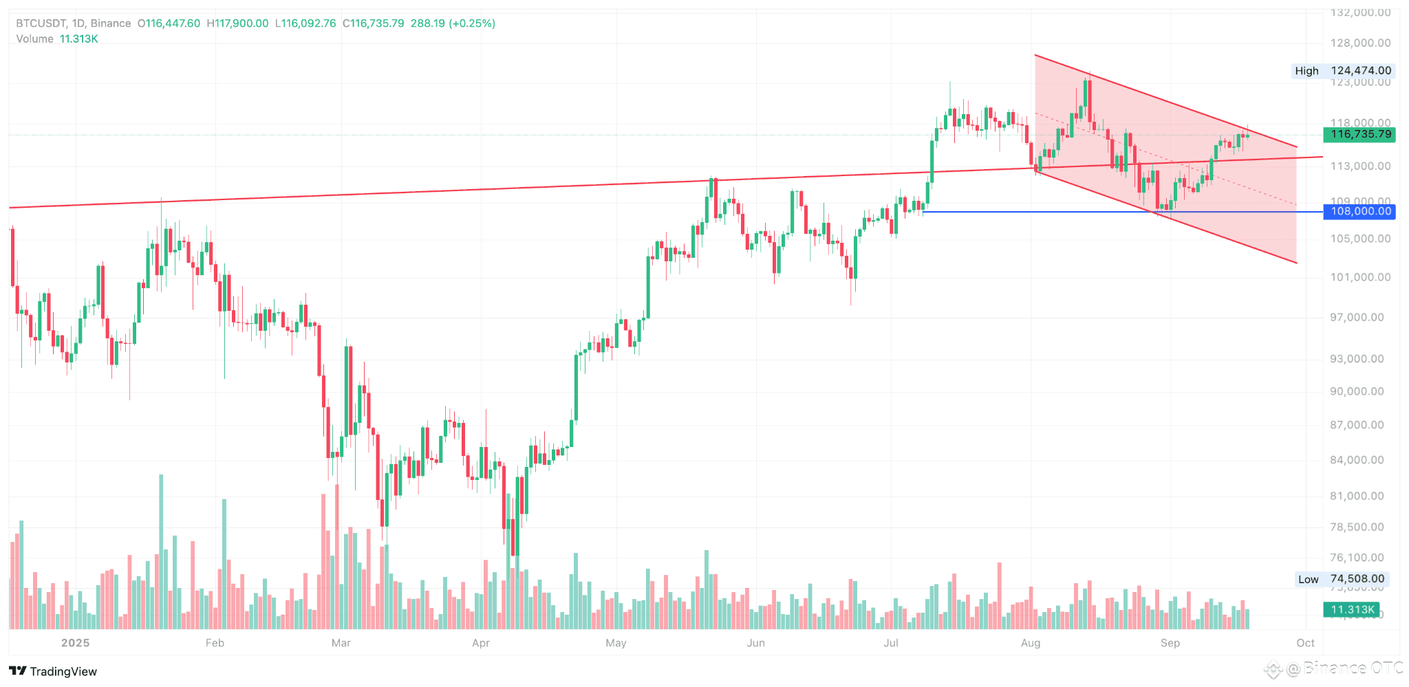 The Fed’s 25 basis point cut was fully priced in a week ago, and BTC has since rebounded from support at $108,000 to around $117,000. The price is currently forming a bullish flag pattern, as highlighted in the chart. We anticipate a short consolidation phase at this level, building momentum for a potential breakout above the upper trendline and the next leg up in BTC’s rally.