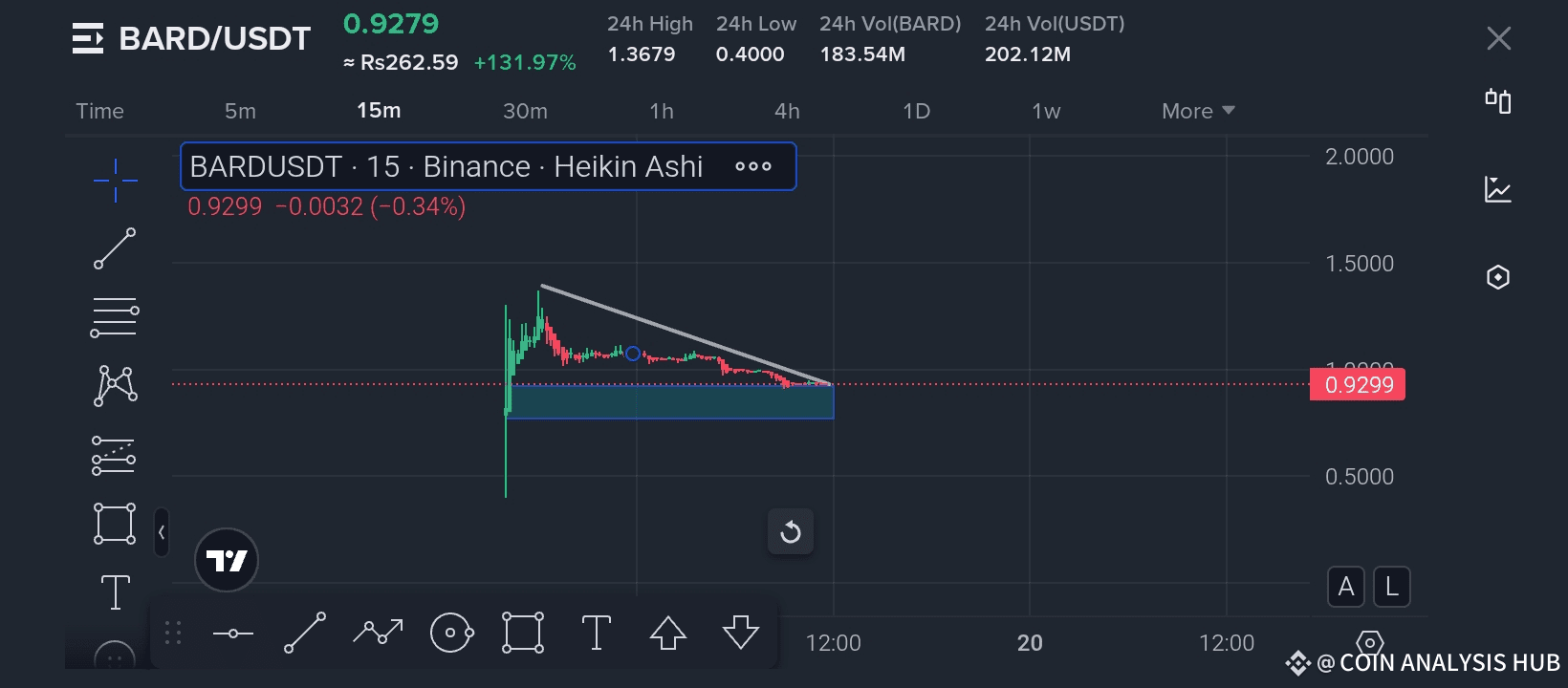 Currently, BARD/USDT is showing an interesting setup on the 15M chart (Heikin Ashi). After a massive pump earlier today, price reached a high of 1.3679 USDT before pulling back into consolidation. Right now, it is trading around 0.92 – 0.93 USDT with a clear descending trendline forming resistance, while a solid support zone has developed at the 0.90 region.