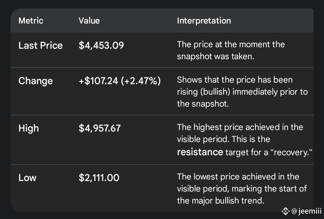 Observed Market Movement Strong Bullish Rally: The left and middle sections of the chart are dominated by large green candlesticks, indicating a powerful and sustained upward trend that moved the price from the Low of $2,111.00 up to the High of $4,957.67. Consolidation and Resistance: After hitting the high, the chart shows a cluster of smaller candlesticks, suggesting a period of consolidation or trading sideways. The price failed to break above the $4,957.67 level, which now acts as a significant short-term resistance.