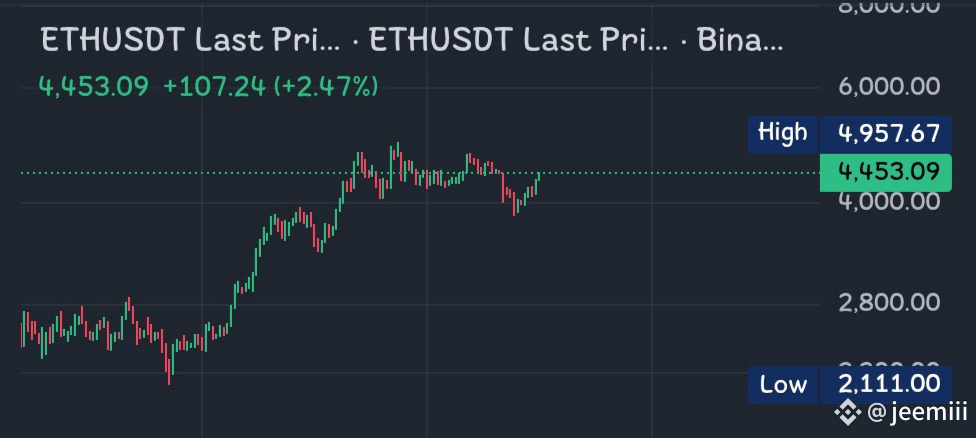 Recent Pullback/Correction: The rightmost section shows several red candlesticks, indicating a recent selling pressure or correction. The current price of $4,453.09 is approximately 10\% below the High, which is a common occurrence after a large rally as traders take profits.