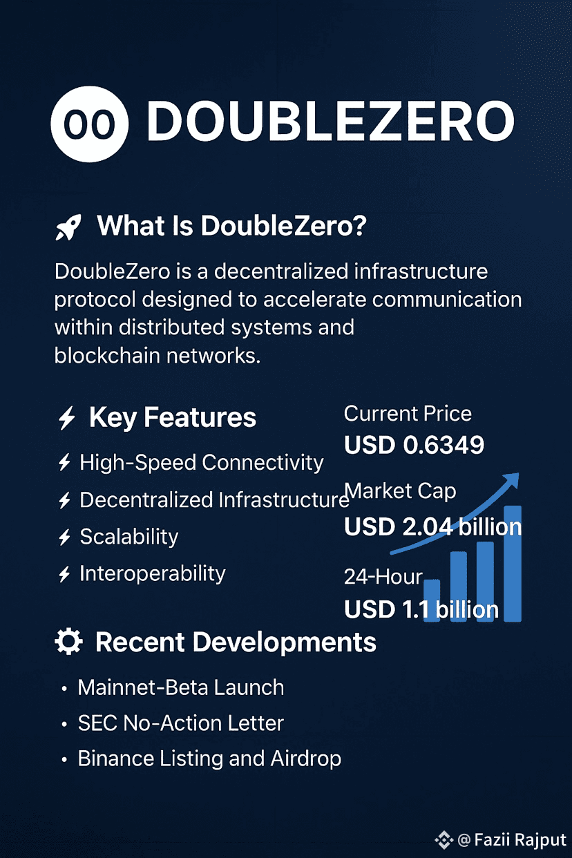 DoubleZero is a decentralized infrastructure protocol designed to accelerate communication within distributed systems and blockchain networks. Its primary objective is to reduce latency and bandwidth constraints by providing a dedicated, high-speed fiber-optic network that connects various blockchain nodes and validators.