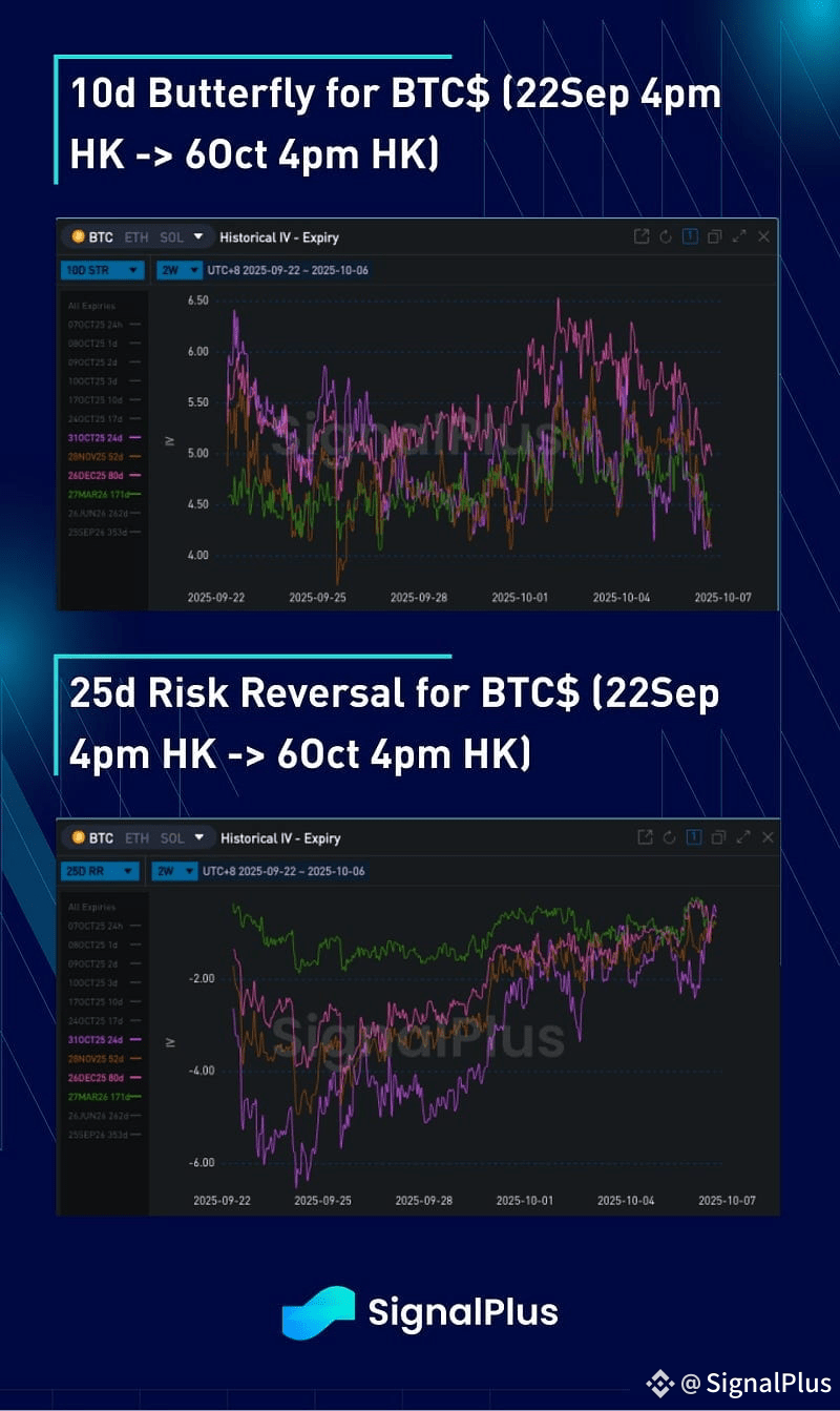 Convexity prices moved lower towards the end of last week as the market was supplied with some wings via call-spread demand. Also the market is perhaps pre-positioning for some fresh overlay topside supply at these levels of spot and thus keeping a lid on implied levels for topside. Against that some opportunistic supply of wing downside on higher spot has also provided further supply. One thing worth noting is that a clean break either side from here of $115–130k would likely see a sharp reprice in levels of skew (i.e. bid for calls above $130k vs bid deeply for puts below $115k), so there is some risky gamma dynamics that offer value to the flies from here