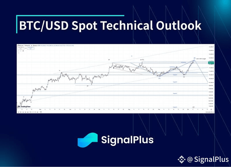 A very sharp and fast move back to test and make new highs in the past week, after probing down to $108k on the month/quarter end rebalances the week prior. Technically, the (extended?) flat correction we have been looking for appears to have begun playing out. Given the price action is broadly consistent with our long term levels, we continue to think a flat correction is the most probable dynamic here and with that we think a high could be made around $129–130k; beyond that we will need to revisit this move as it becomes increasingly likely to be part of a progressive move. We expect good support on pull-backs initially to $120–118k, but any moves below that could signify that we are moving into our eventual expected more aggressive Wave C correction lower (below $100k)