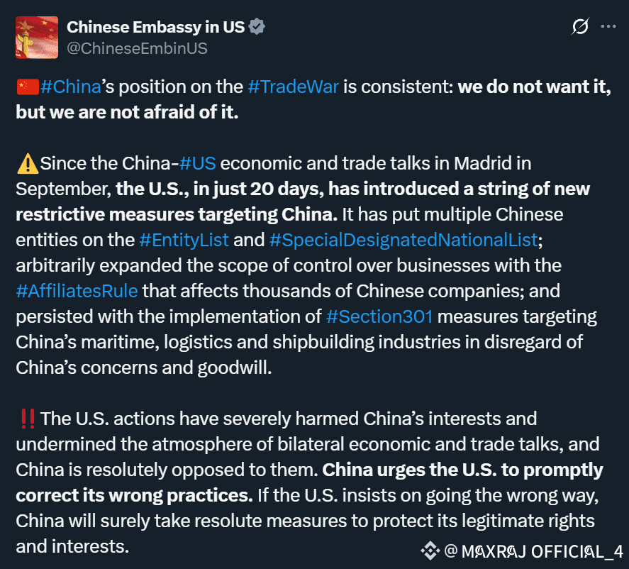 Following a series of newly imposed U.S. tariffs and export restrictions, Beijing criticized the measures as harmful to bilateral relations and global trade stability. The statement emphasized that China will take resolute actions to protect its economic interests and industries if tensions continue to rise.