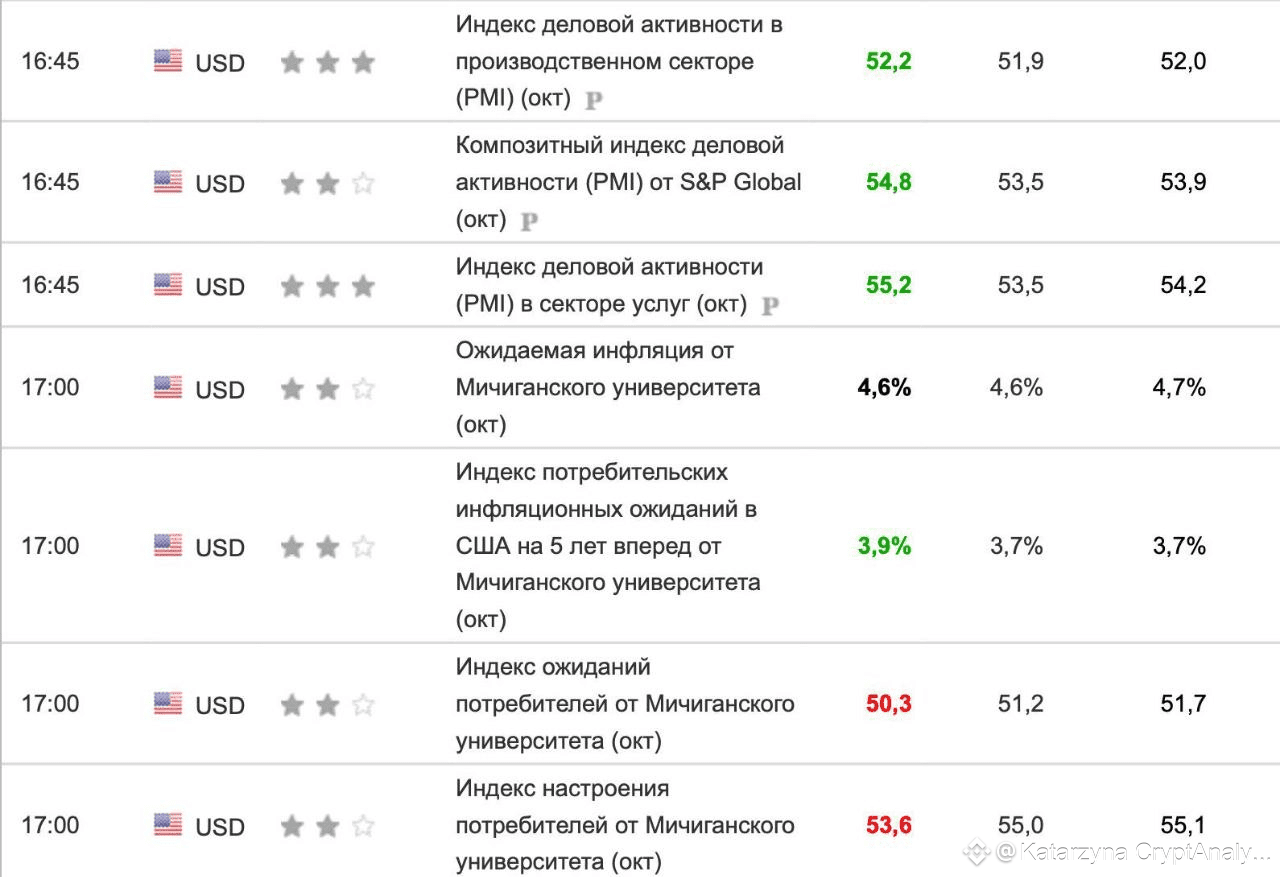 - Индекс настроения потребителей от Мичиганского университета (октябрь): 53,6 при прогнозе 55,0 и предыдущем показателе 55,1. Ожидания и настроения снизились, отражая осторожность домохозяйств.
