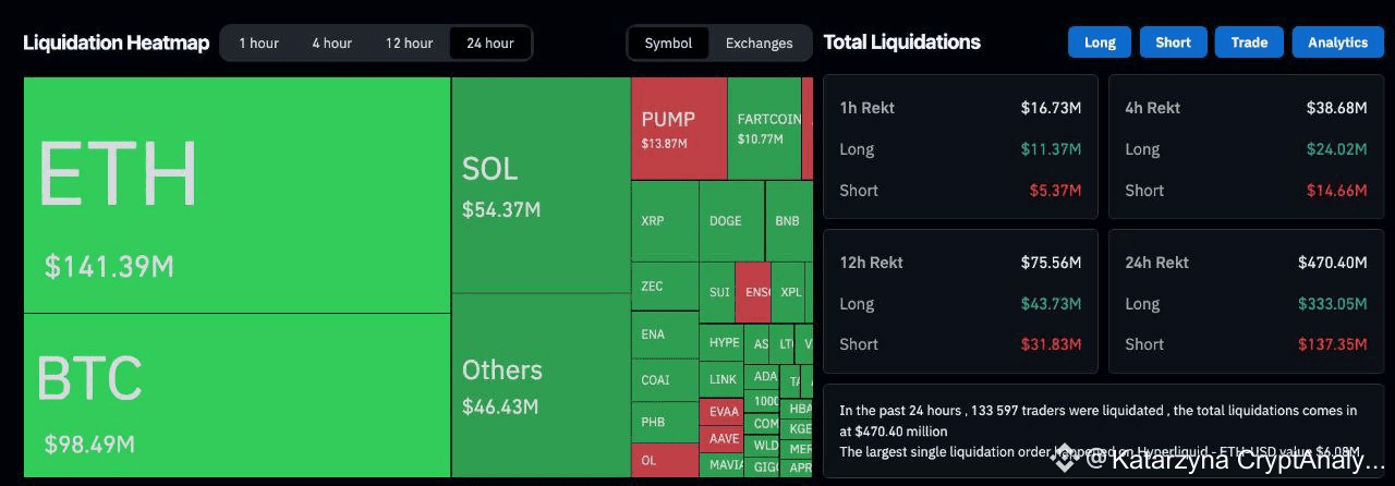 Ликвидаций на крипторынке за 24 часа - на 470,40 млн $. Из них быки 333,05 млн $, медведи - 137,35 млн $. Больше всего проблем прошедшее ночью снижение принесло тем, кто ставил на рост ETH, BTC, SOL. А в целом за последние дни суточный объем ликвидаций достигал и внушительных 500 млн.