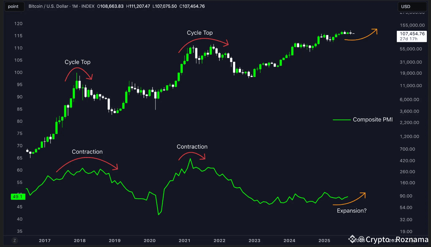 Historically, every major Bitcoin top aligned perfectly with the ISM PMI peaking and then rolling into contraction 📉.