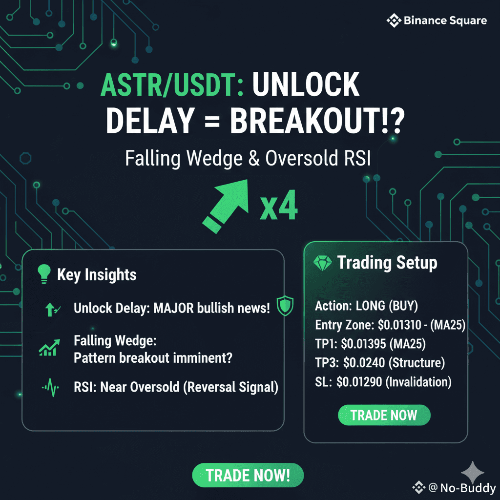 Falling Wedge Pattern: Some analysis suggests ASTR has been forming a Falling Wedge pattern (a bullish reversal pattern). This pattern is often confirmed when volume decreases during the wedge formation (which ASTR shows) and then sharply increases during the breakout. The low current volume is consistent with the pre-breakout consolidation phase of a Falling Wedge.