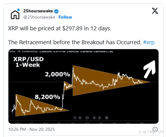 The forecast originates from a chart shared by the user 25hoursawake, who highlighted a massive symmetrical triangle pattern along with past breakout events that led to explosive gains. According to their interpretation, XRP is approaching a point where a historic breakout could occur — one far larger than anything seen previously.