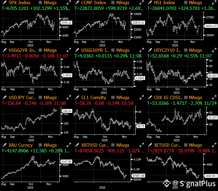Crypto showed tentative signs of stabilization following past week’s dramatic sell off. Prices have bounced off the low 80k to trade close to 88k in early Monday, as the market heads into the Thanksgiving holiday week with some cautious optimism as Fed President Williams revived expectations for a December rate cut. A strong equity rally (SPX +1.5%, Nasdaq +2.7%) ahead of the early month-end rebalancing flows also helped to bolster risk sentiment