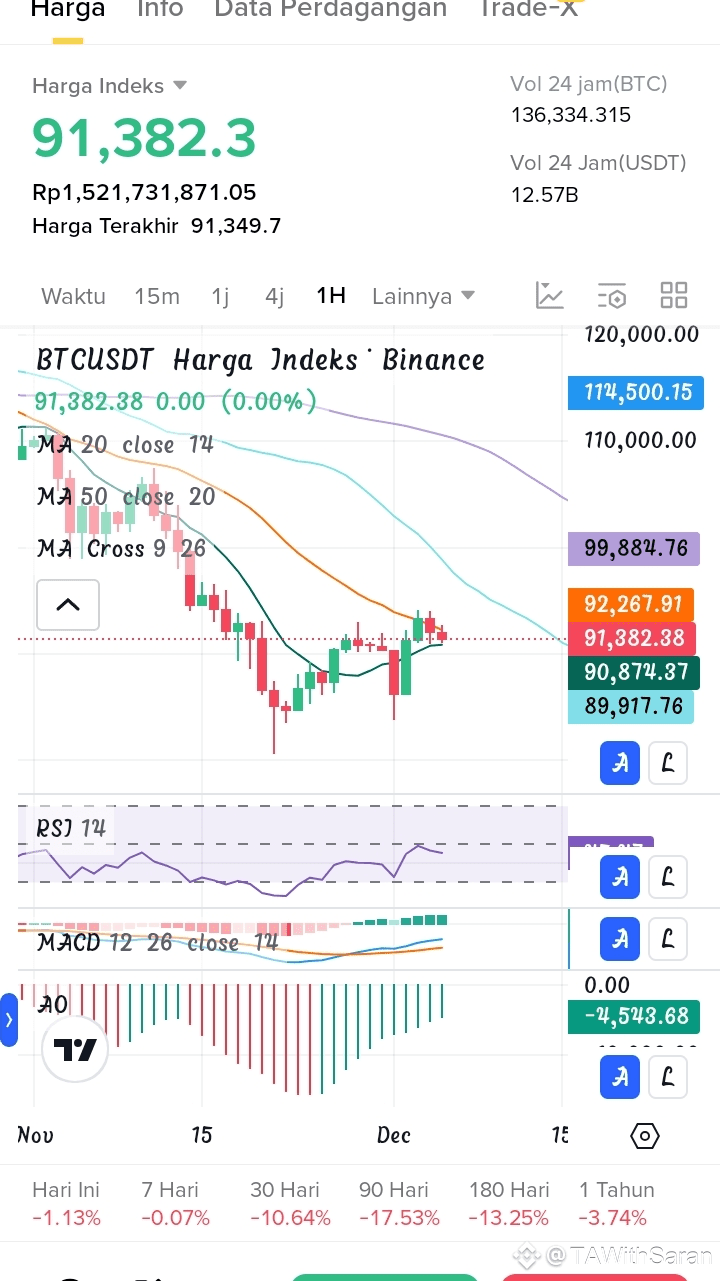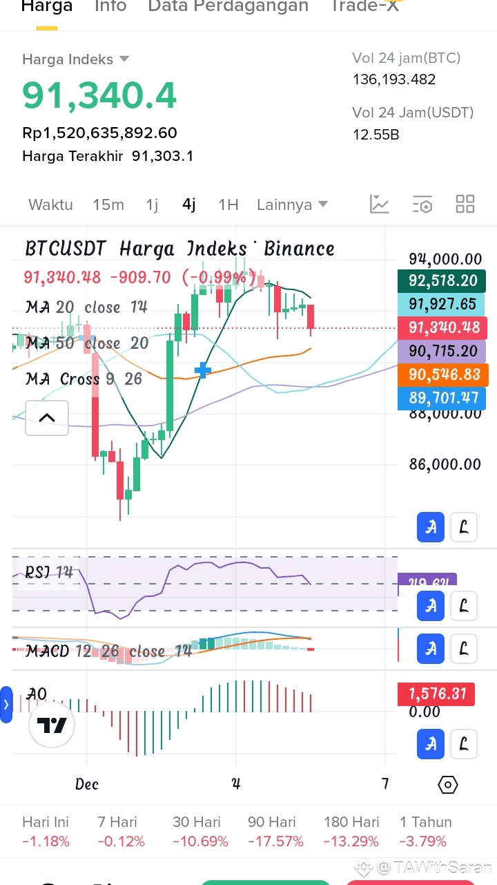 - Harga Saat Ini: sekitar $91,340.4 (data terkini), turun ~0.56% dalam 24 jam terakhir.