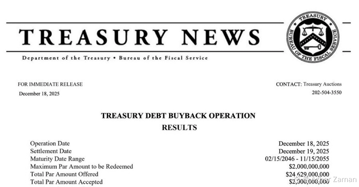 December 19, 2025 — The U.S. Department of the Treasury has executed a $2 billion debt buyback, repurchasing its own Treasury securities from the market in a strategic move that’s capturing attention across both traditional and crypto markets.
