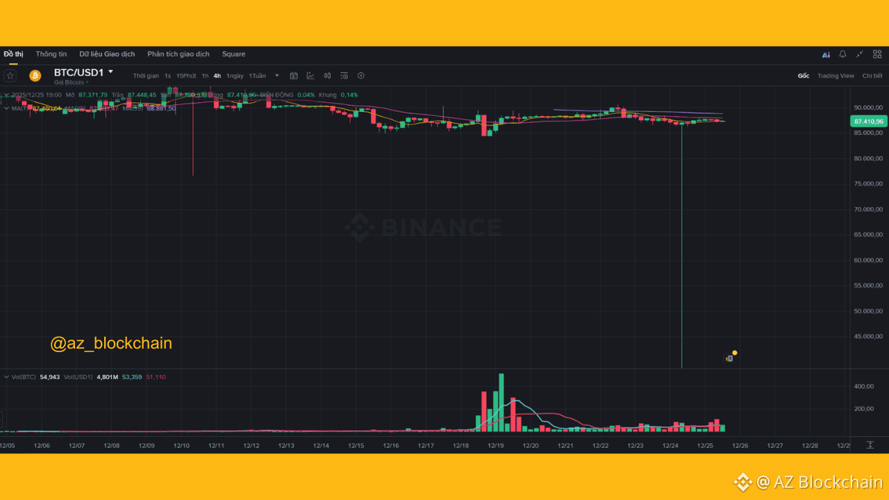 ✨Cặp $BTC/USD1 trên Binance vừa xảy ra flash crash, giá rơi mạnh xuống $24,000 chỉ trong vài giây rồi nhanh chóng hồi lại trên $87,000. Sự cố không ảnh hưởng đến các cặp lớn như $BTC/USDT, nhưng phơi bày rõ rủi ro thanh khoản ở các cặp giao dịch mới.