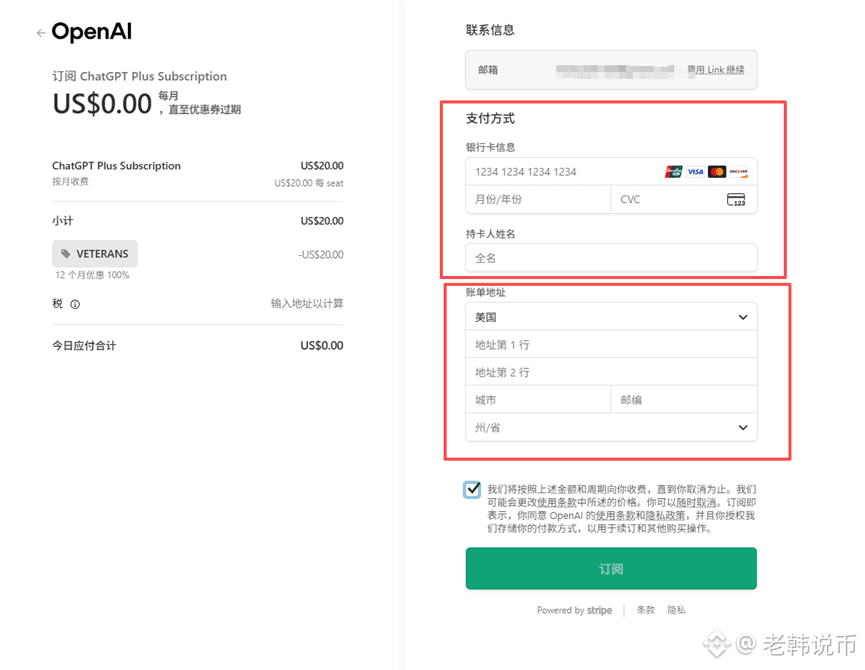 第三步dc验证成功后,我们就可以领取优惠,填写付款信息了,这里付款信息可以使用bitget或者safepal的u卡,当然其他u卡也行,我自己用的safepal,这里需要注意账单地址需要填美国的,不知道怎么弄的用谷歌搜索一下就行了,填好账号账单信息按步骤走就行了,如下图