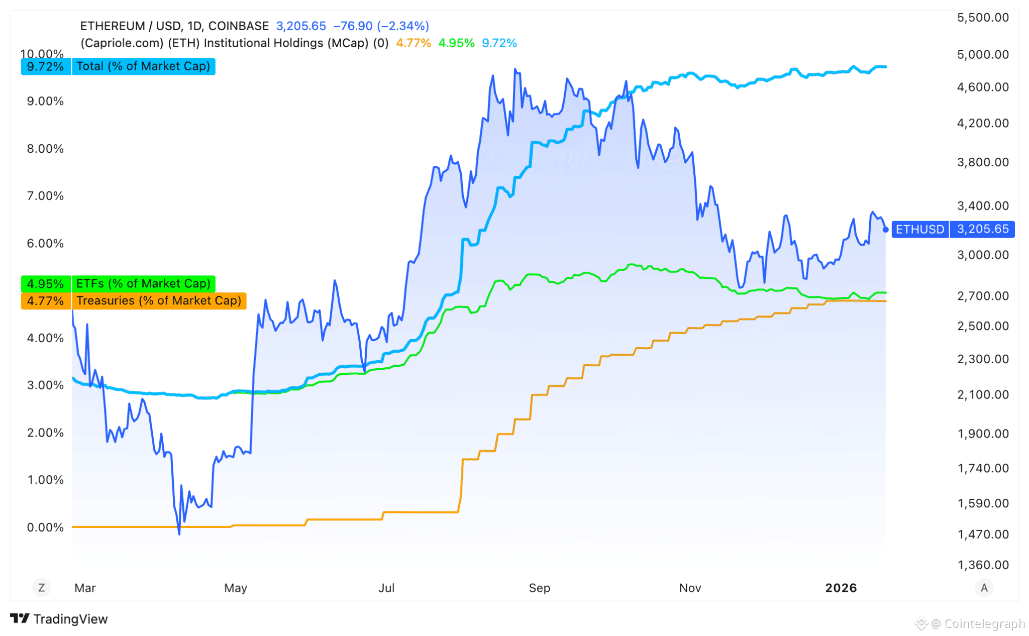 The sharp increase underscores a swift consolidation of Ether into the hands of major institutional and corporate players.