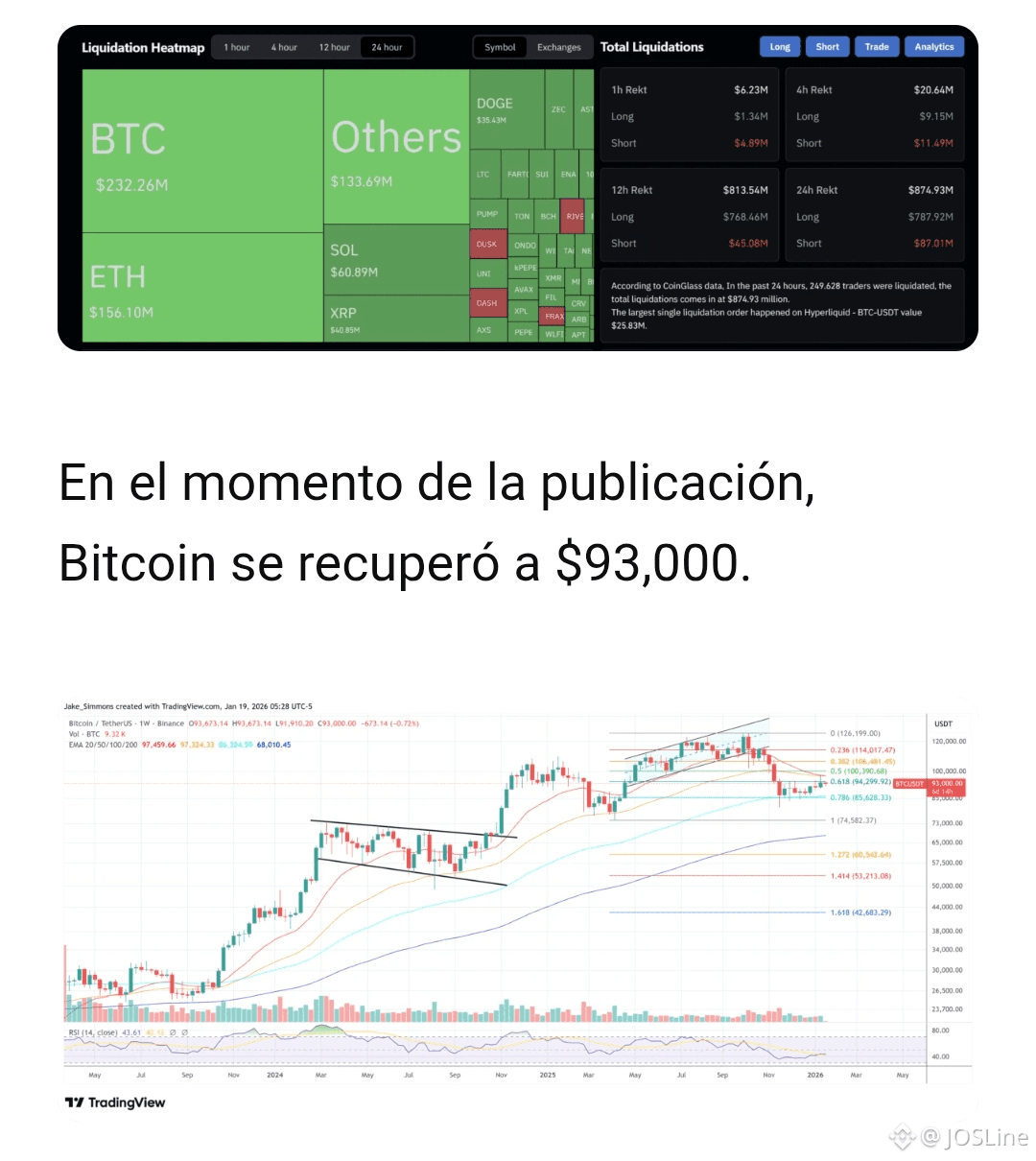 Los datos de Coinglass mostraron que 249.422 traders fueron liquidados, con liquidaciones totales de $874.93 millones en las últimas 24 horas.
