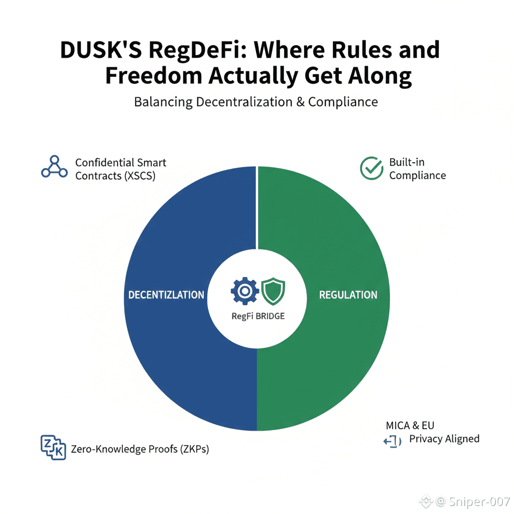Man, figuring out how to mix real regulation with proper decentralization is tough. Most projects either go full wild west or lock everything down so much it feels like TradFi 2.0. But Dusk Network's RegDeFi thing? It actually feels like they're nailing it. They don't slap compliance on top like some band-aid – they build it straight into the core protocol. That way big institutions can get in without needing a million middlemen, and it lines up with EU stuff like MiCA and those privacy rules.