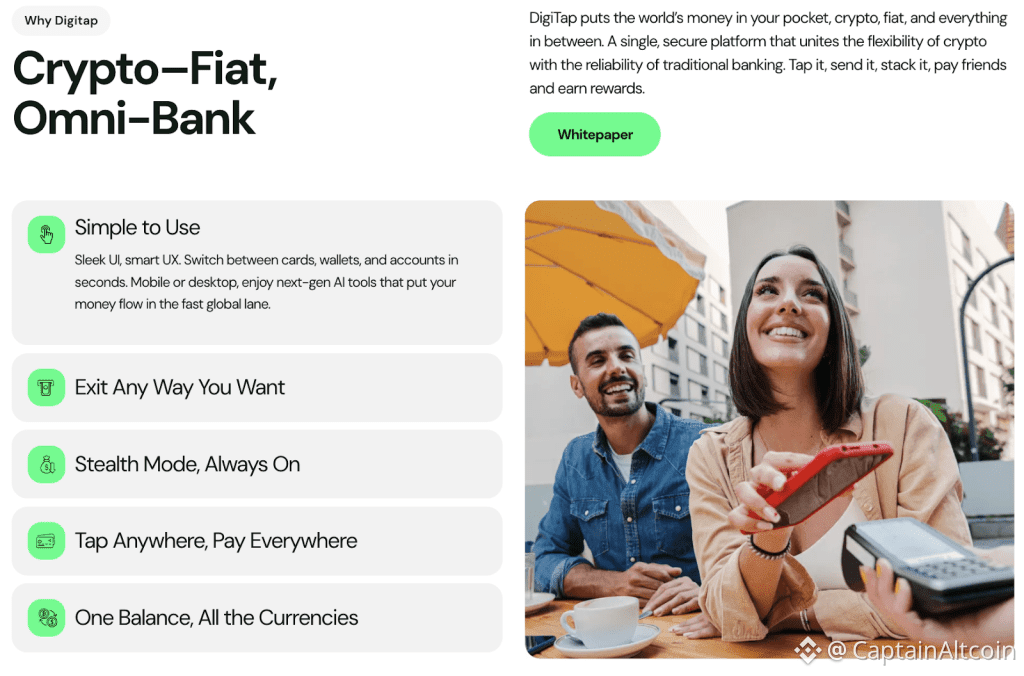 Digitap positions itself as more than a payments app. The platform is built as a full omni-bank, bringing crypto and traditional financial tools into a unified experience across mobile and web, rather than limiting users to a single transaction flow.
