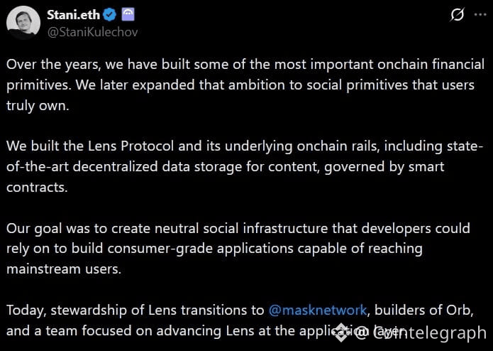 Decentralized finance (DeFi) protocol Aave transferred stewardship of the social infrastructure protocol Lens to Mask Network, shifting responsibility for advancing consumer-facing social applications while retaining Lens as open-source infrastructure.