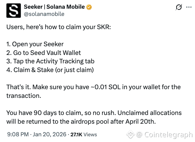 Users of the Solana Seeker smartphone have 90 days to claim SKR tokens as part of the airdrop, which can be staked to earn rewards.