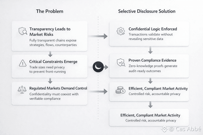 In conventional markets exposure is controlled. A fund does not show its position sizes on a real-time basis. A treasury desk does not make announcements over rebalancing plans in advance. The issuer does not release any sensitive investor information to the world to demonstrate compliance. However, audits, reports, and enforcement remain with regulators. The system is effective since disclosure is not absolute.