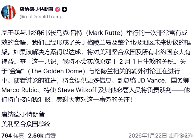 就在刚才川普在 truthsocial 公开表示,将不会在2月1日实施格陵兰关税 。