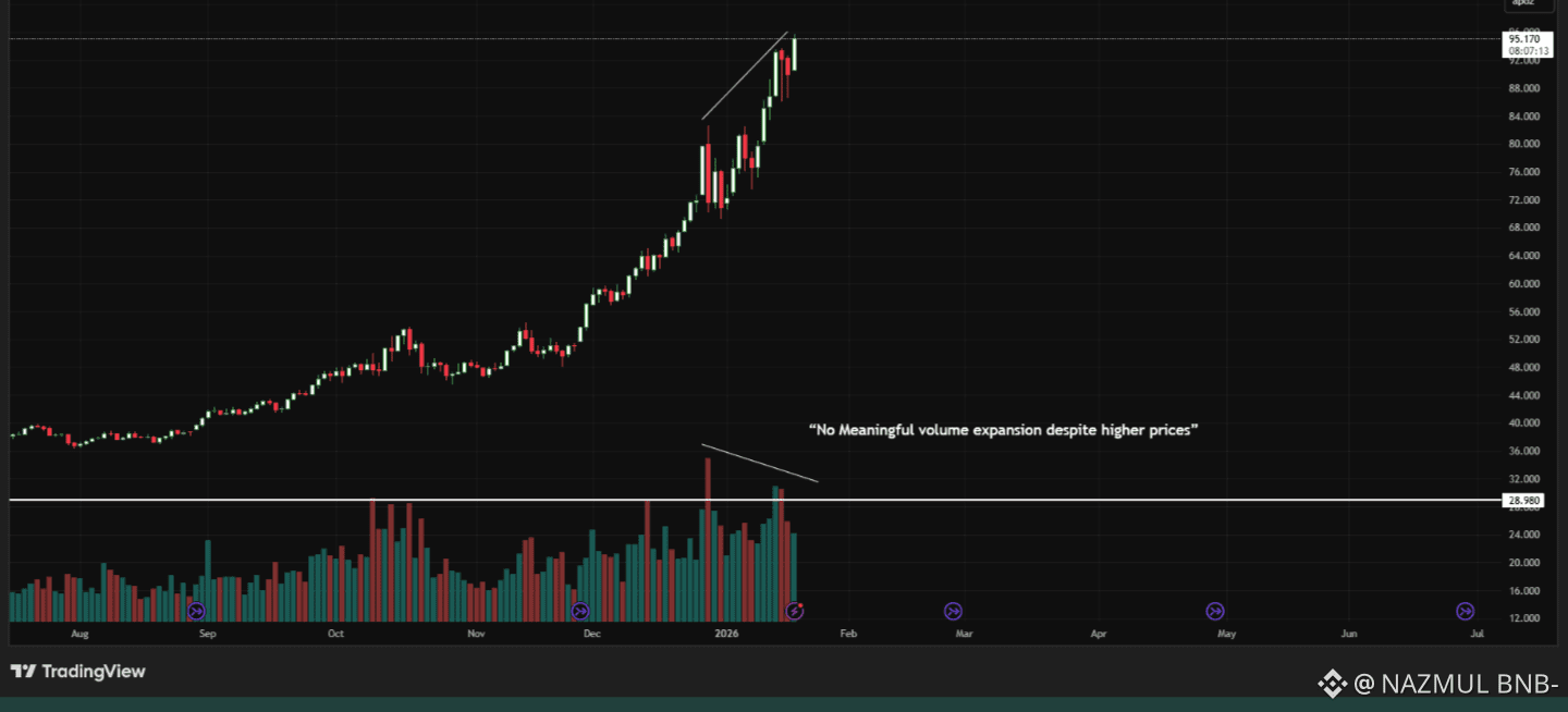 What this price action reflects is not aggressive demand, but a quiet absence of supply. Sellers are stepping back, not buyers rushing forward. This is a fragile condition, one that often precedes gaps rather than trends.