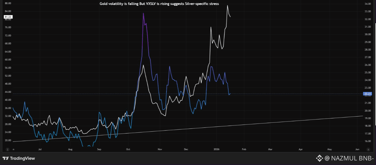 Gold volatility (GVZ) has begun to stabilize and cool, suggesting that broader macro stress—rates, central banks, geopolitics—has already been absorbed. Silver volatility, however, continues to rise independently.