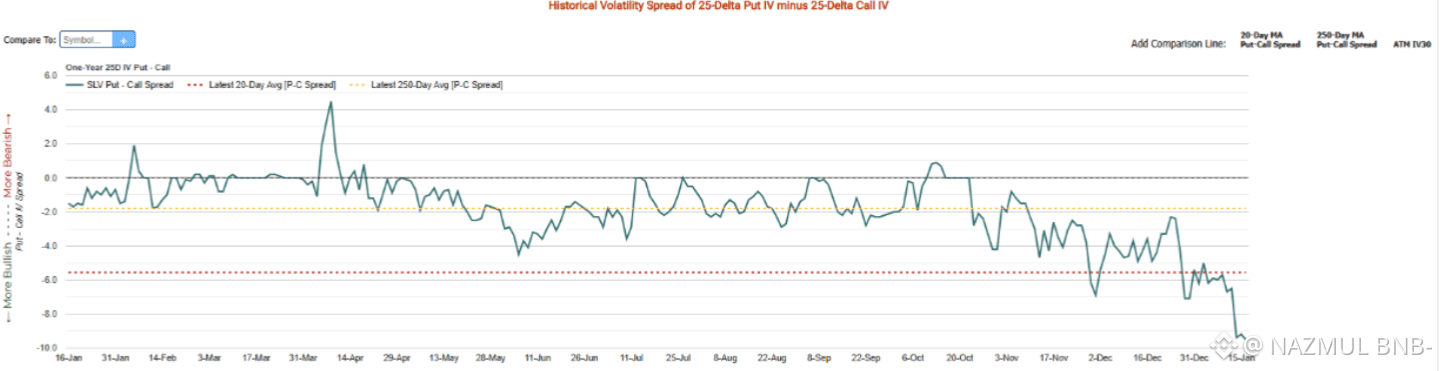 One of the most revealing signals comes from the 25-delta put–call implied volatility spread in SLV options.