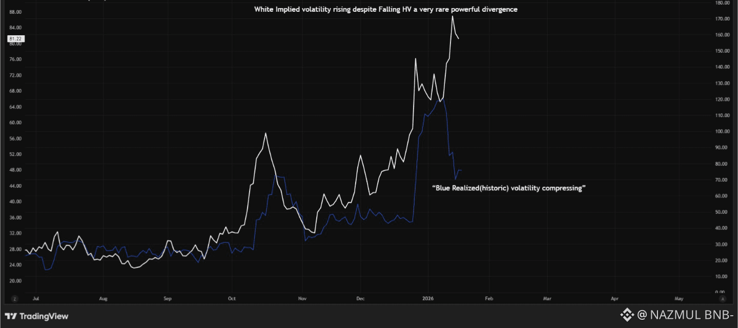 This divergence is rare and meaningful. Options are forward-looking instruments. When implied volatility rises despite falling realized volatility, it indicates that option writers do not trust the apparent calm. They are pricing not trend risk, but jump risk.