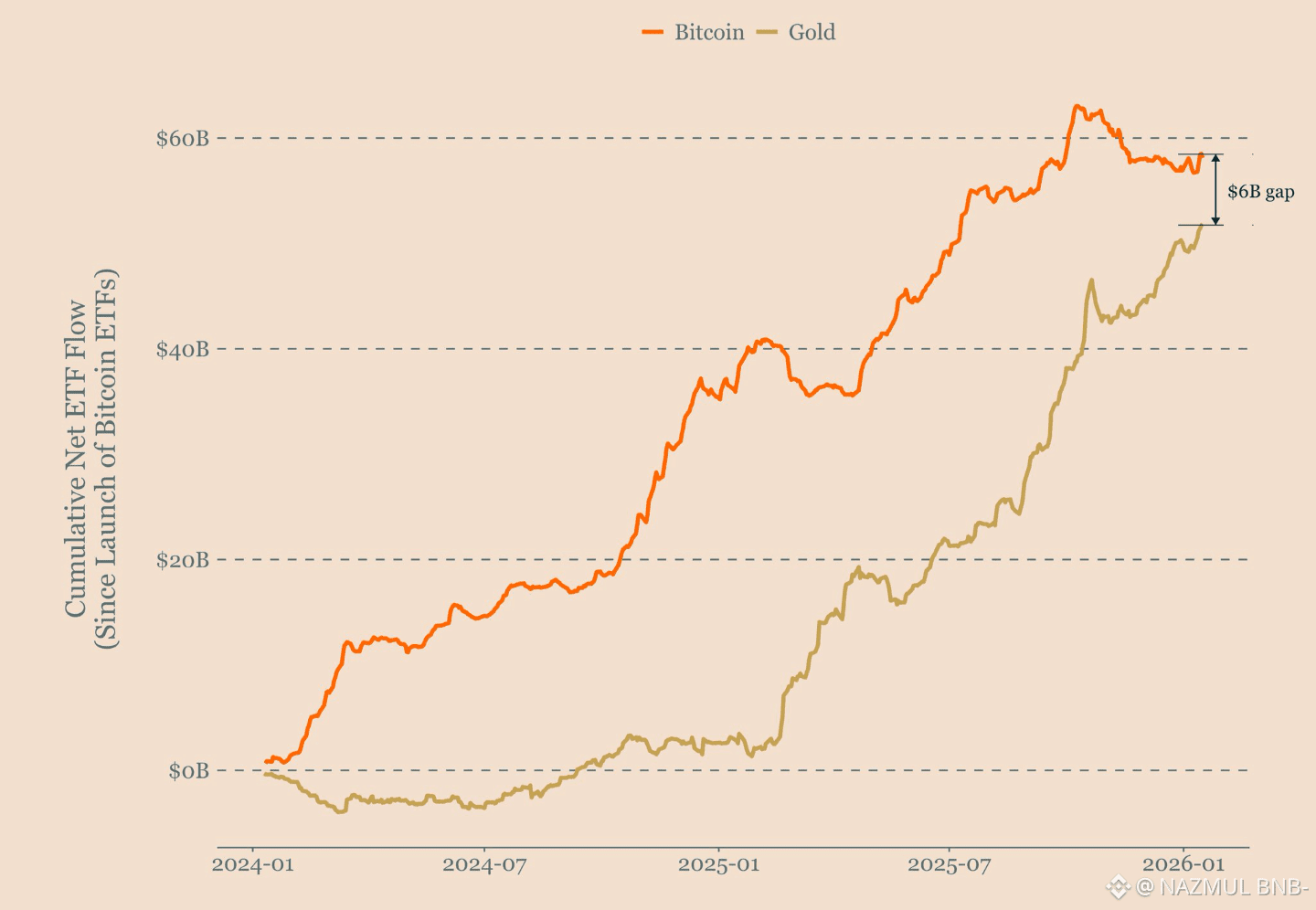 Since November, Bitcoin ETF flows have stalled. Gold ETF flows haven’t. As a result, gold is now only about $6 billion behind Bitcoin’s roughly $58 billion in cumulative net inflows over the same period. And the gap continues to close.