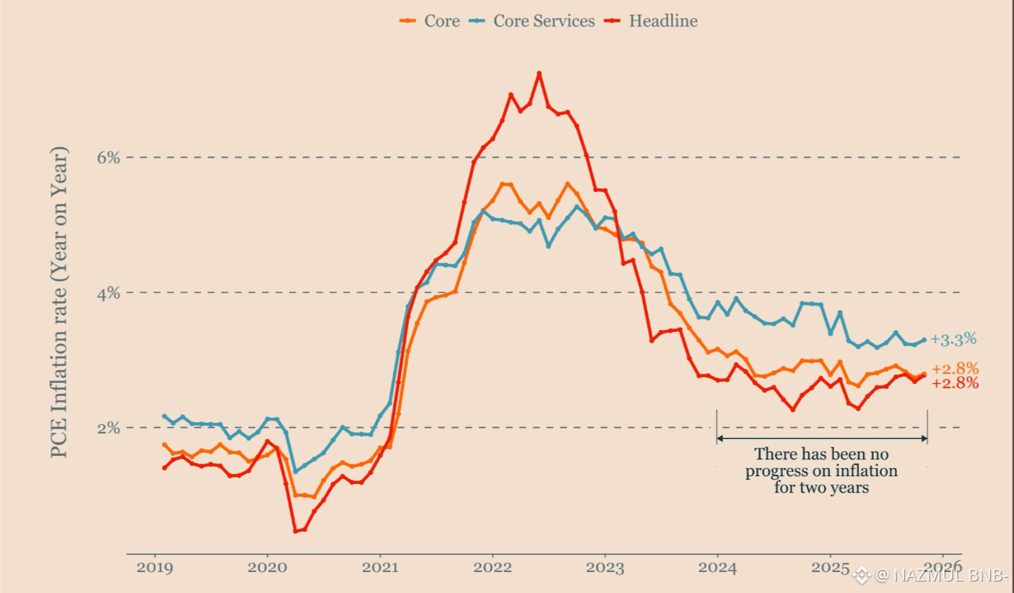 The chart below shows year-on-year PCE inflation, which I remind you is the Fed’s preferred gauge of inflation. Even smoothing out short-term noise and data delays related to the government shutdown, the message is straightforward: inflation has been stuck at elevated levels for roughly two years.