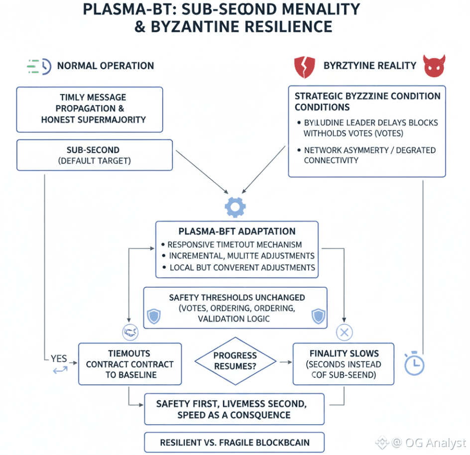 When people talk about sub-second finality, it’s often framed as a constant—something a network either has or doesn’t. But when I look closely at PlasmaBFT, I don’t see finality as a static promise. I see it as a target the protocol continuously works to maintain, even under imperfect and adversarial conditions. That distinction matters, especially once Byzantine behavior enters the picture.