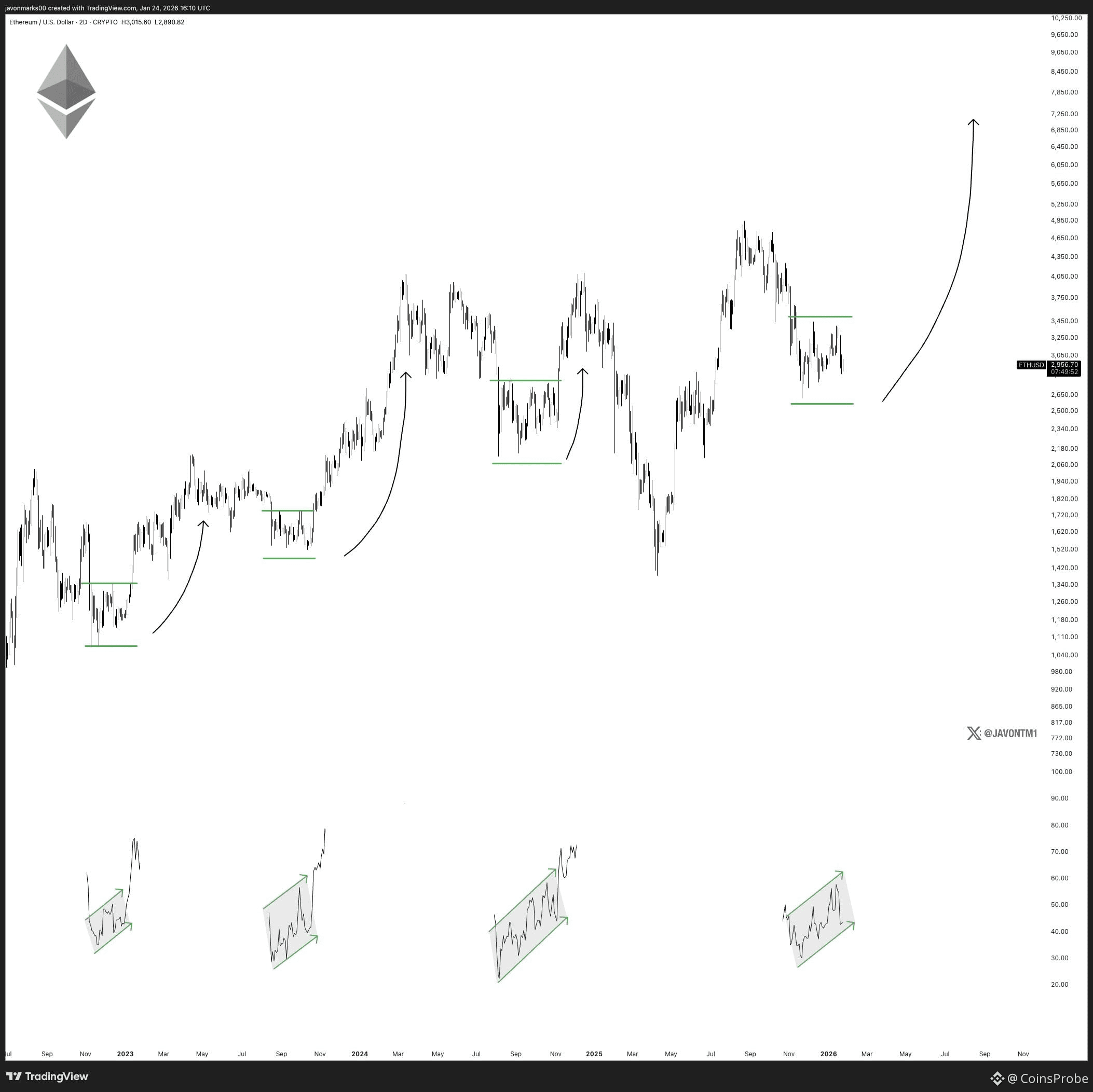Ethereum’s current price action may feel quiet, but beneath the surface, structure is clearly forming. With $ETH still 40% below ATH, a repeating fractal pattern highlighted by Javon Marks, stabilizing RSI, and record-breaking transaction activity on January 16, the market appears to be building rather than weakening.