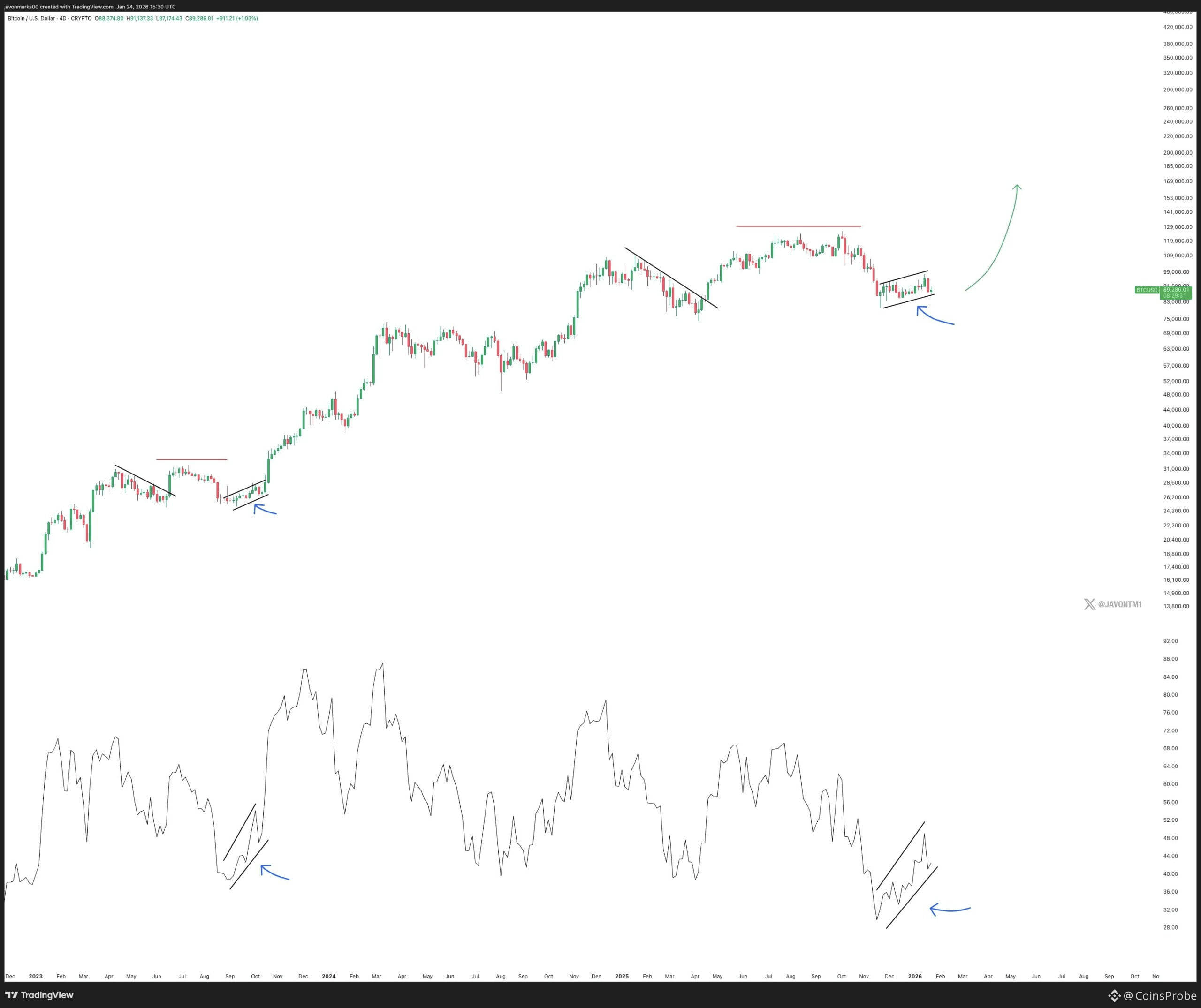 Currently, Bitcoin appears to be following a similar path. After correcting from its recent all-time high near $126,000 to the $80,000 region, BTC has begun forming an ascending channel, characterized by higher highs and higher lows. This structure closely mirrors the consolidation phase seen before the previous breakout.