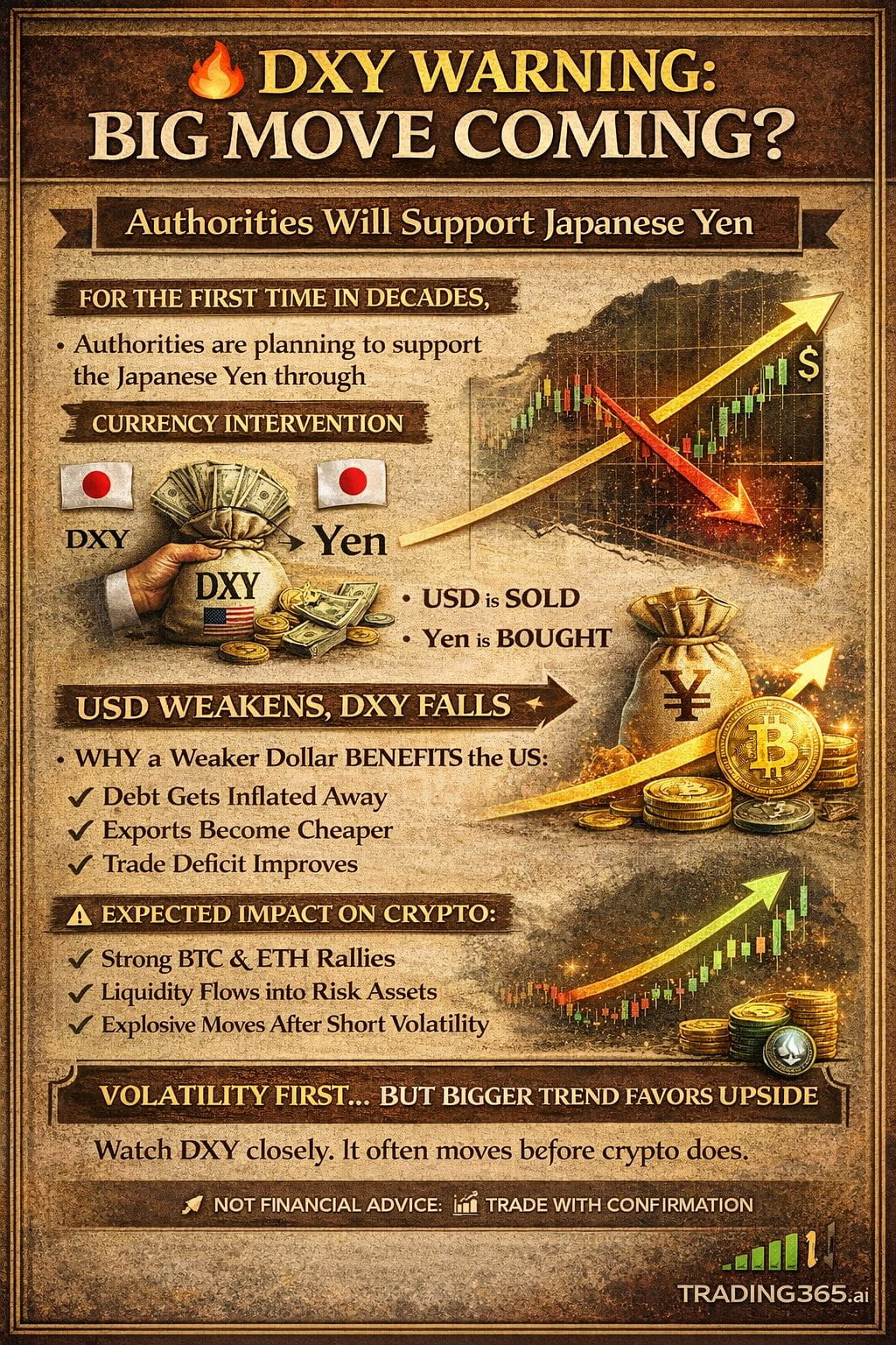 📊 What this means for crypto: Historically, a falling DXY leads to: • Strong BTC & ETH rallies